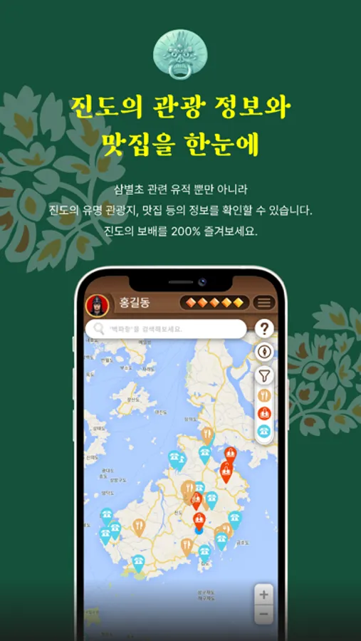 ∎ 진도 삼별초 AR 미션투어를 통해 진도 곳곳에 남겨진 삼별초 관련 유적지의 정보를 애니메이션과 게임형태로 확인할 수 있으며, 진도군의 유명 관광지, 맛집 등의 정보를 함께 확인할 수 있습니다.