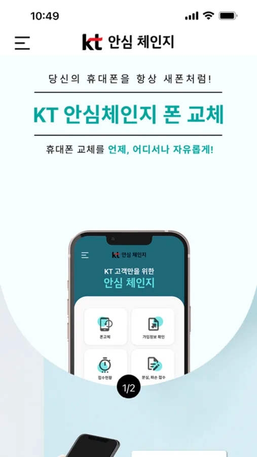 ** KT 폰 교체 센터는 가입 시 매월 이용료가 있으며, 등록된 휴대폰을 반납하고 가입 휴대폰과 같은 모델의 휴대폰 또는 유사한 다른 모델의 휴대폰으로 24개월간 2회까지 교체할 수 있는 서비스 입니다. 해당 서비스에 가입대상의 경우 KT 폰 교체 센터 APP을 통해 교체 서비스를 신청을 할 수 있습니다.