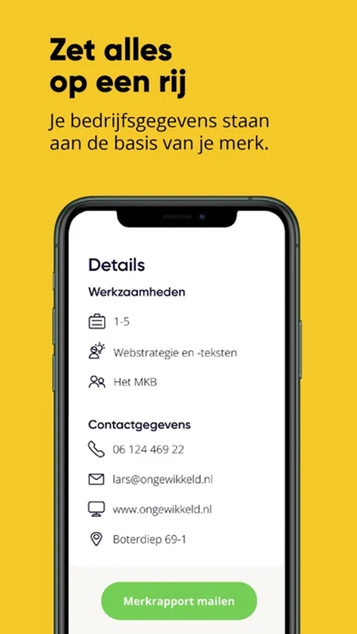 Zodra je merkprofiel compleet is, genereer je automatisch je merkrapport. Dat bestaat uit je bloedeigen merkverhaal en de belangrijkste gegevens. Zo heb je je merk altijd op zak, maar je kunt je merkrapport ook doorsturen als document. Handig voor medewerkers of externe partners.