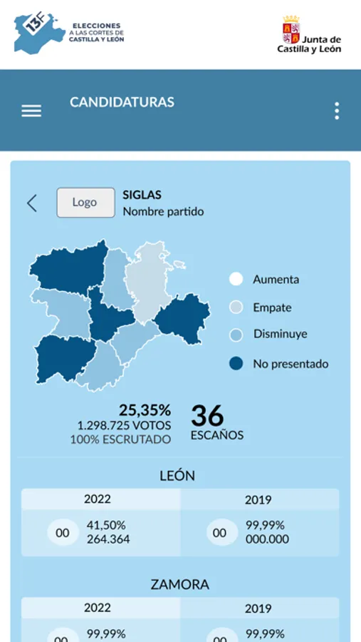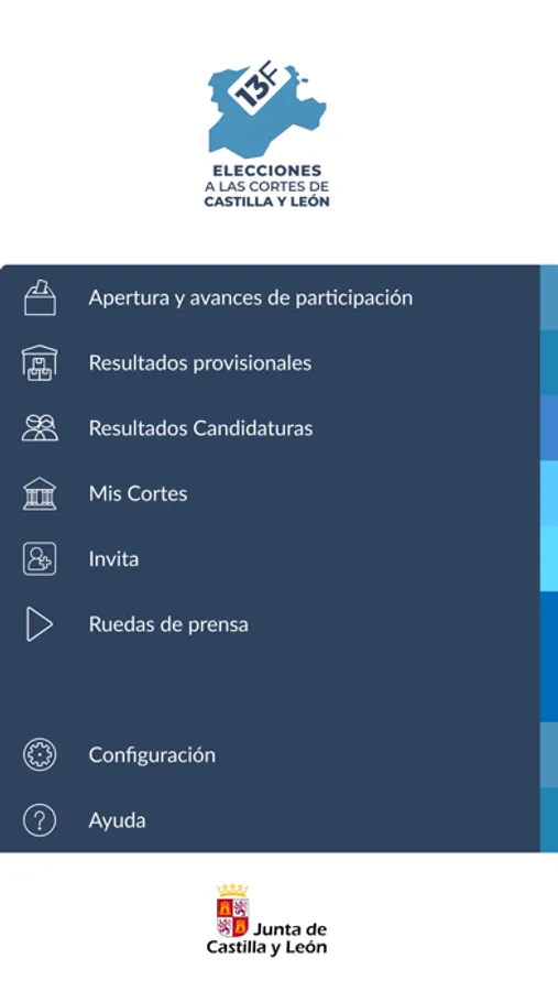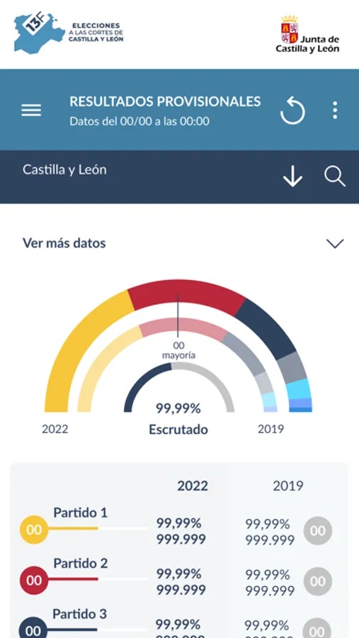 “Elecciones Castilla y León 13F 2022” es la aplicación oficial y gratuita que la Junta de Castilla y León pone a disposición de los ciudadanos para consultar los resultados provisionales de las elecciones a las Cortes de Castilla y León del 13 de febrero de 2022. Permite consultar en tiempo real los datos de apertura de mesas y avances de participación, así como los resultados provisionales obtenidos por todas las candidaturas por ámbito geográfico (Comunidad, provincias y municipios). También permite agrupar candidaturas para estudiar posibles composiciones de las Cortes.