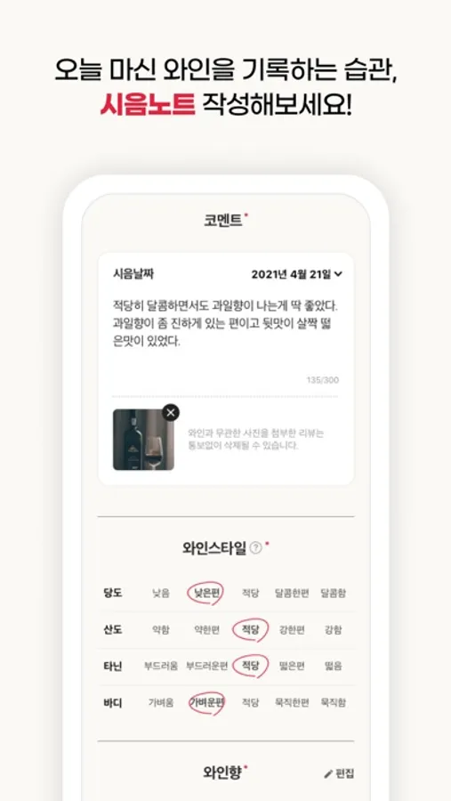 오늘 마신 와인 좋았어요! 와인 후기를 ‘시음노트‘에 기록해보세요.