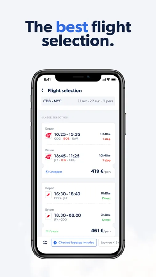Book the best flight options on the Ulysse app. No ads, no hidden fees, no redirections. To top it off, we also have an extraordinary customer service (4.9/5 on Trustpilot). Our goal? To make you fly.