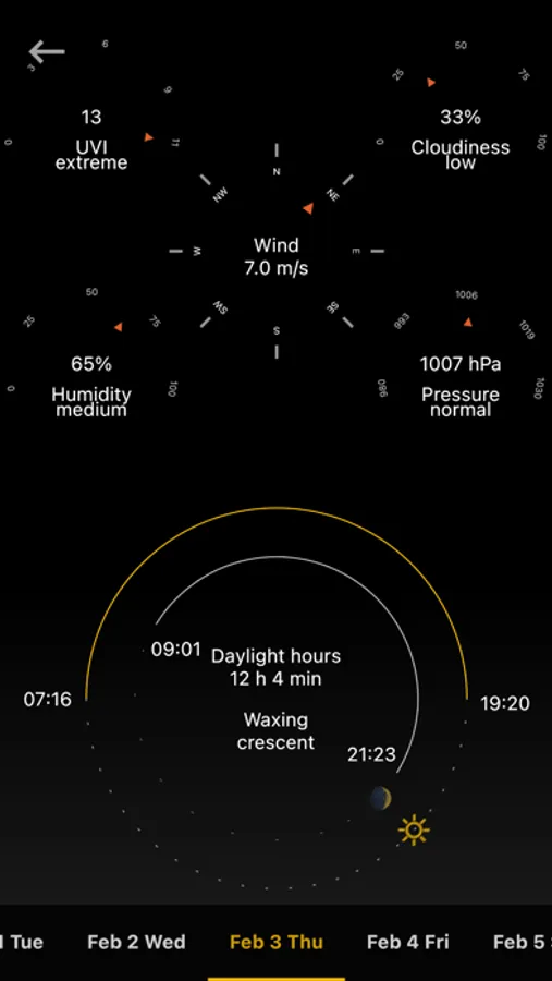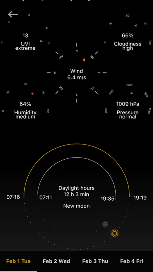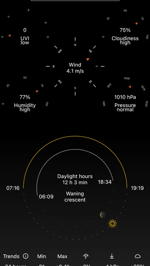 *Essential parameters for well-being explain the values: the ultraviolet index (UVI), cloudiness, humidity, pressure, wind speed, and direction. (premium function)