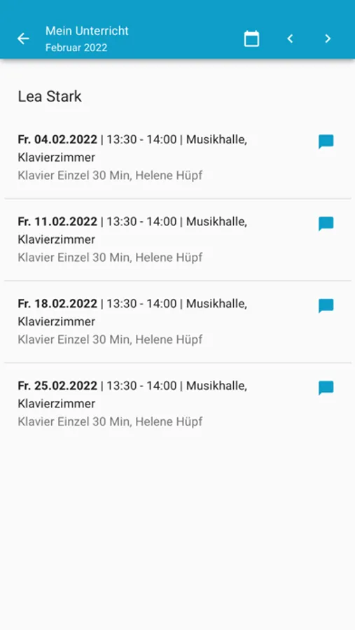 Sämtliche Funktionen zum Austausch von Nachrichten zwischen Lehrkräften, Eltern, Schüler*innen und der Musikschulverwaltung setzen keinerlei Kontaktinformationen voraus. Die Übermittlung von Nachrichten erfolgt über eine App-interne ID. Zum Chat und Nachrichtenaustausch sind keine E-Mail-Adressen oder Handynummern erforderlich!