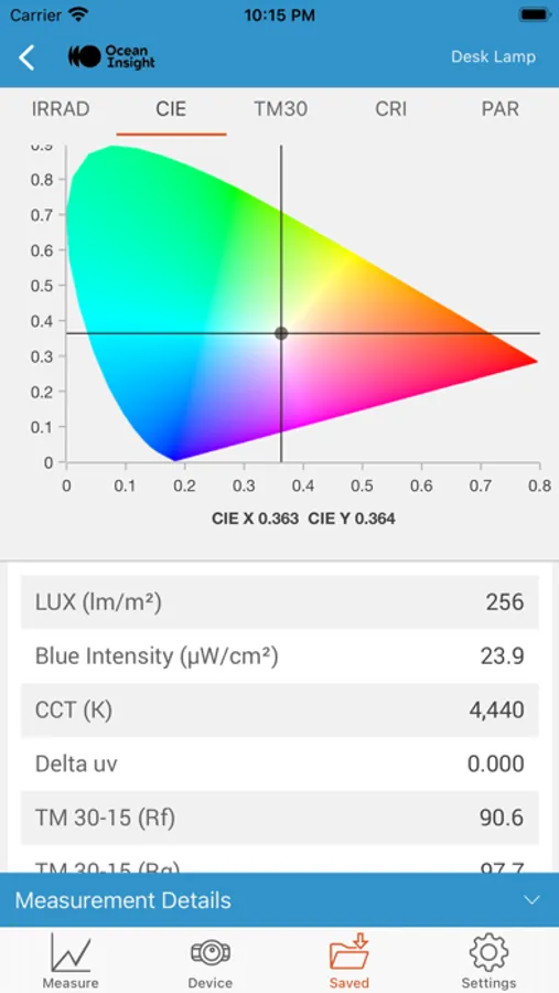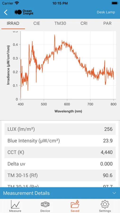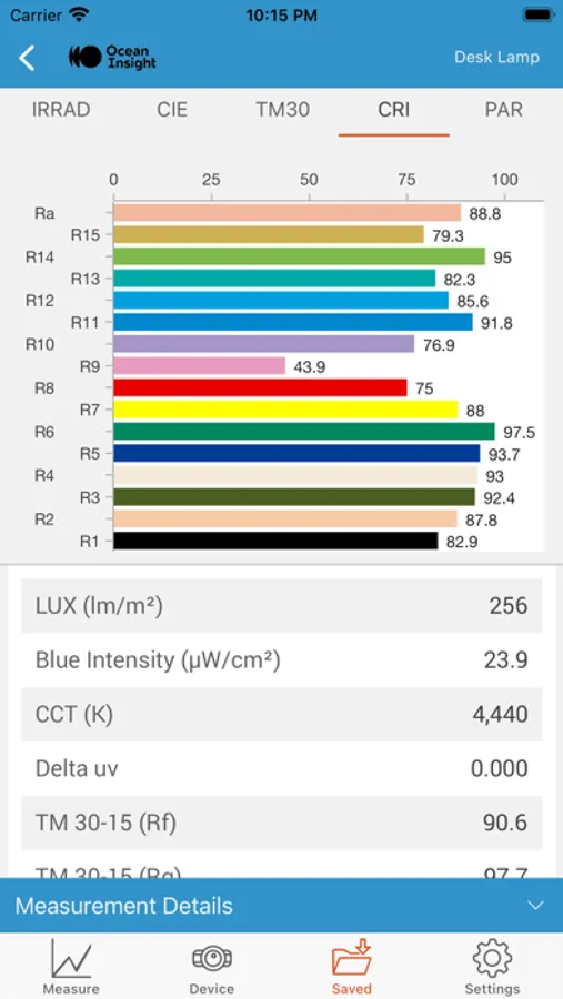 - Lux, CRI (Ra, R1 – R15), CCT, TM30