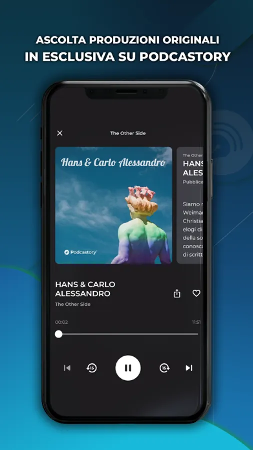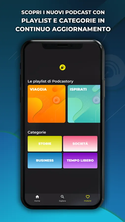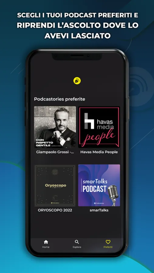 Inserisci nei preferiti i podcast che vorresti ascoltare e crea le tue playlist, cosi li avrai sempre nella sezione dedicata in app.