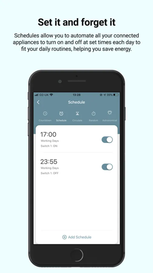 • Schedule routines - Automate all of your connected appliances to turn on and off at set times each day to fit your daily routines and help save energy.