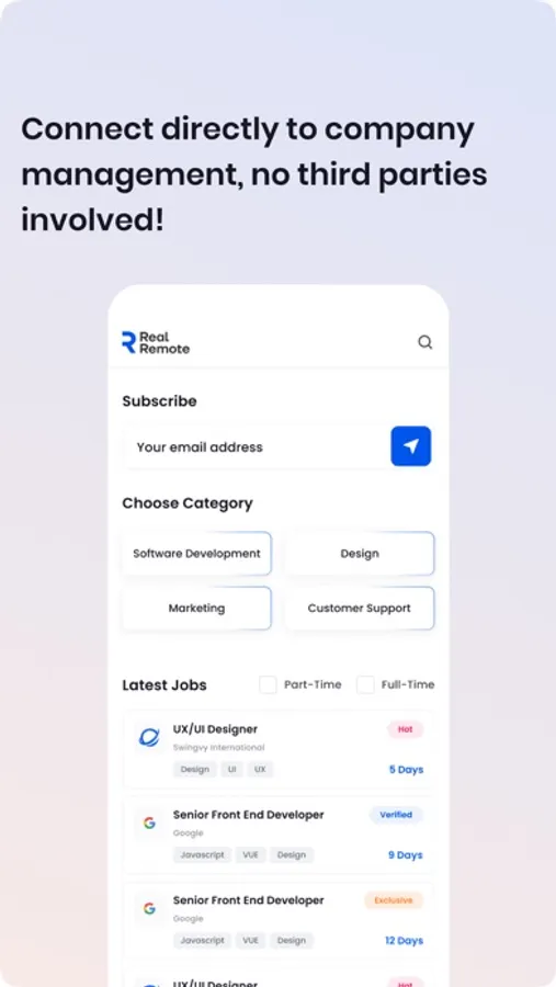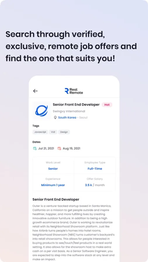 The main difference between other job-posting websites and RealRemote is the fact that the job offers posted on here are verified, and connect potential employers directly to company management, since dealing with HR bureaucracy on most Job listing sites is something many of us would rather avoid. We realized multiple, exclusive and job-focused online communities that we found throughout our careers are far better places to directly reach company management for real and up-to-date job offers. However, access to these channels is limited, it takes time, experience and trust. We hand-pick curated offers and turn them into job applications, so our users don’t have to go through the bureaucracy of recruiters or chaos of group chats.
