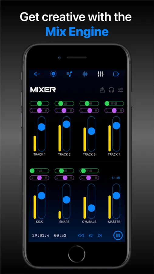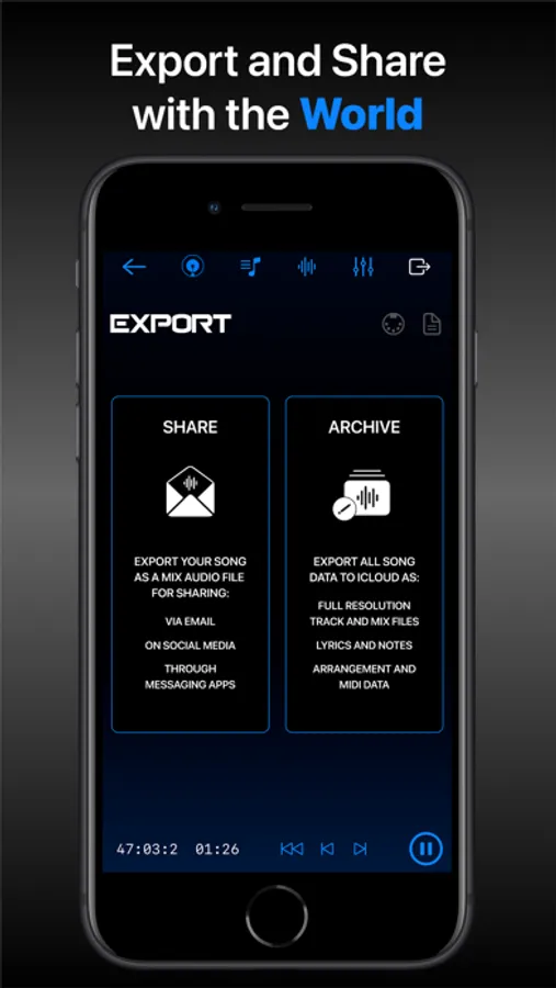 • Export your mixes, MIDI data and individual audio files to share with the world!