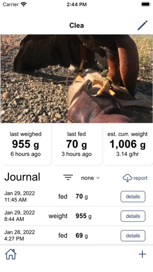Falconry Journal takes that old notebook where you log all of your birds feedings, weight and kills digital. It automatically pulls data about the weather, location and time of your kills to make logging easy and fun. It also provides tools that allow you to more accurately predict your bird(s)' weight at any given time, so that you never miss a hunt. Falconry Journal allows you unlimited birds and data, and backs it all up securely in the cloud in case you need to change phones.