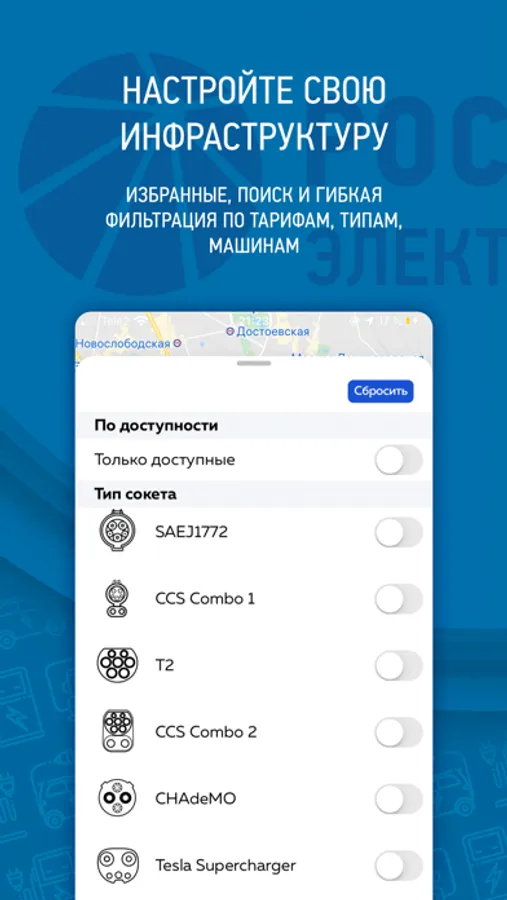 - Гибкая фильтрация инфраструктуры по типам, разъёмам, тарифам, по вашему электромобилю и т.п.;