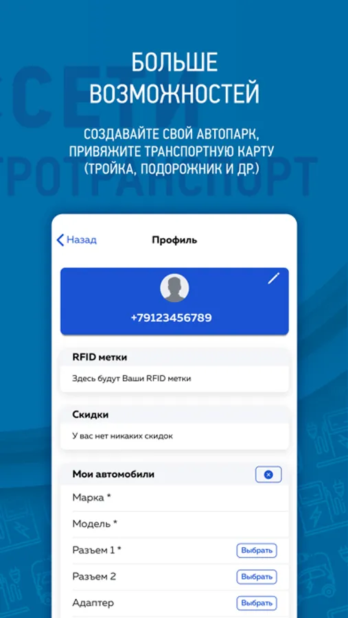 - Привязка транспортных карт (Тройка, Подорожник и т.п.) для удобства запуска и останова зарядных сессий;