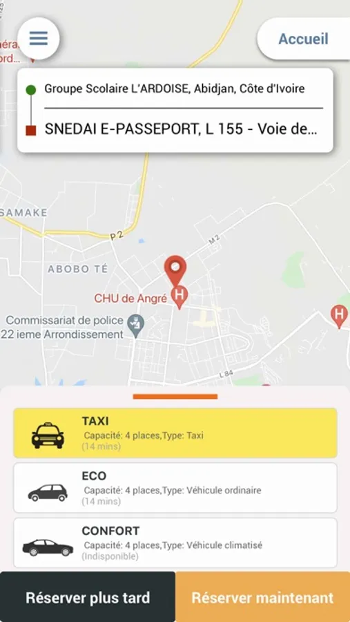 - Vous avez le choix entre 3 catégories de véhicule : le taxi classique de couleur orange, le VTC et le mode confort avec des véhicules climatisés et confortables