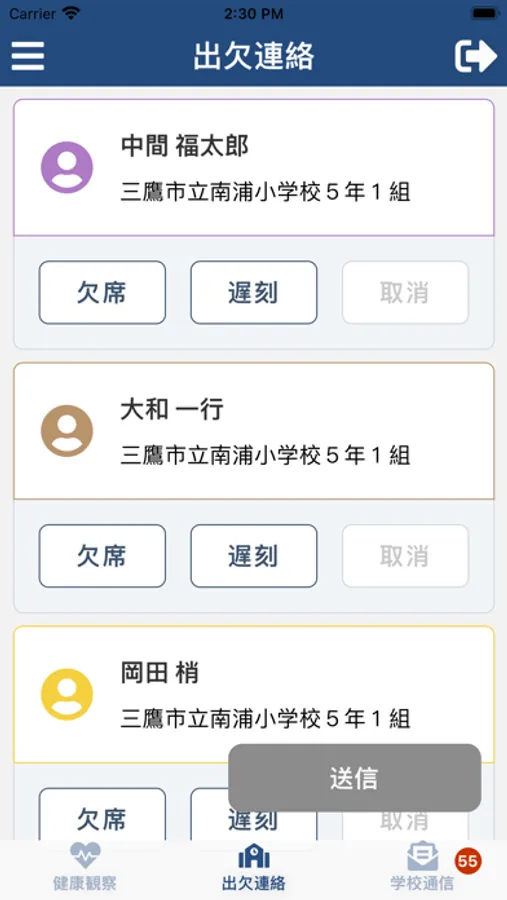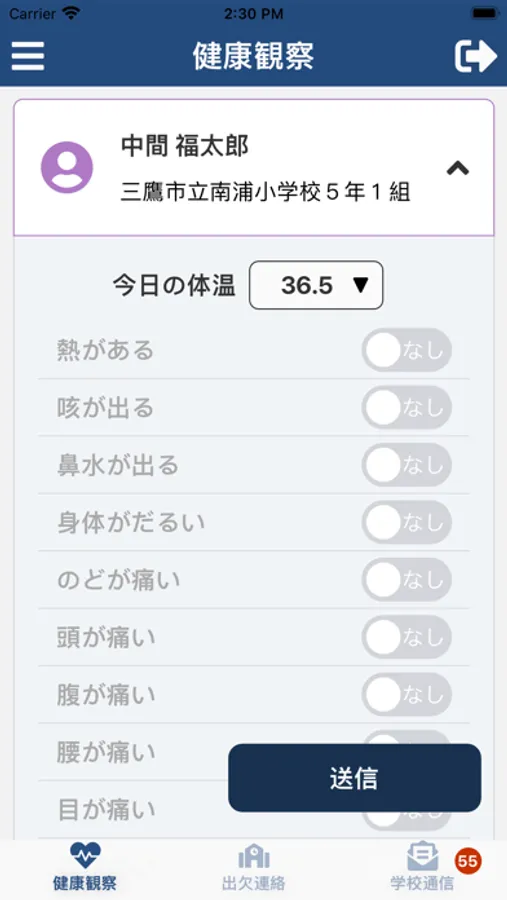 SchoolBand(保護者)は生徒の健康状態や出欠を入力するアプリです。
