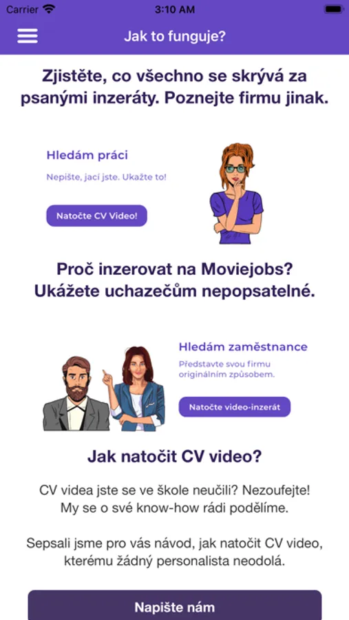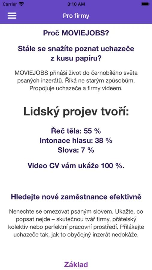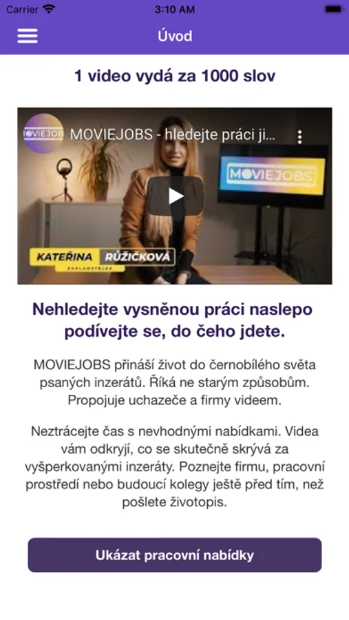 MOVIEJOBS přináší život do černobílého světa psaných inzerátů. Říká ne starým způsobům. Propojuje uchazeče a firmy videem. Neztrácejte čas s nevhodnými nabídkami. Videa vám odkryjí, co se skutečně skrývá za vyšperkovanými inzeráty. Poznejte firmu, pracovní prostředí nebo budoucí kolegy ještě před tím, než pošlete životopis.