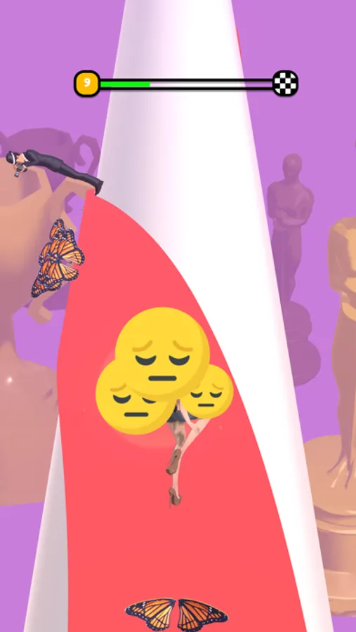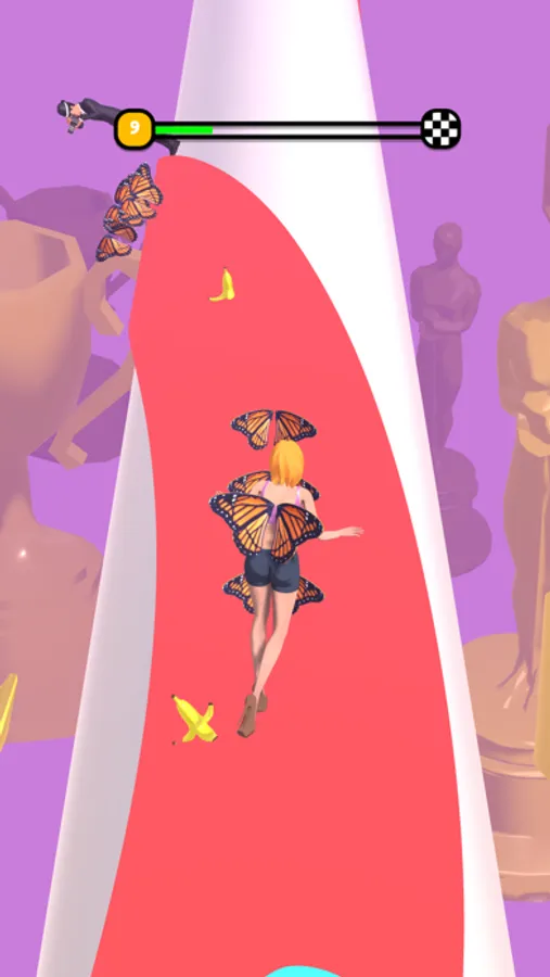 You are a butterfly girl in a famous movie celebratory. You must collect as wings to survive, and stick to red carpet as much as possible. There are dangers on the carpet but outside the carpet also damages your wings. If you have lots of wings, you may use shortcuts. Note: Butterfly girl also likes to have photos.