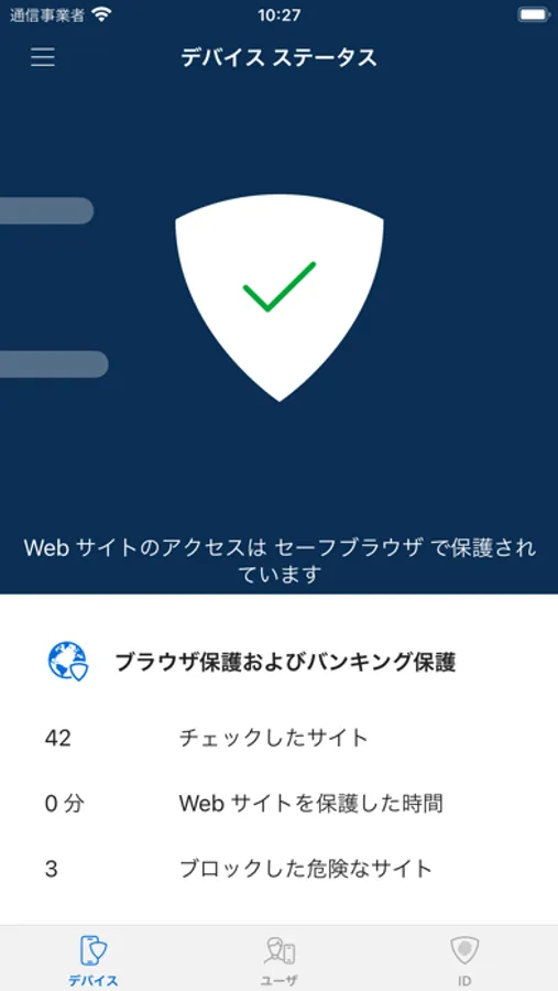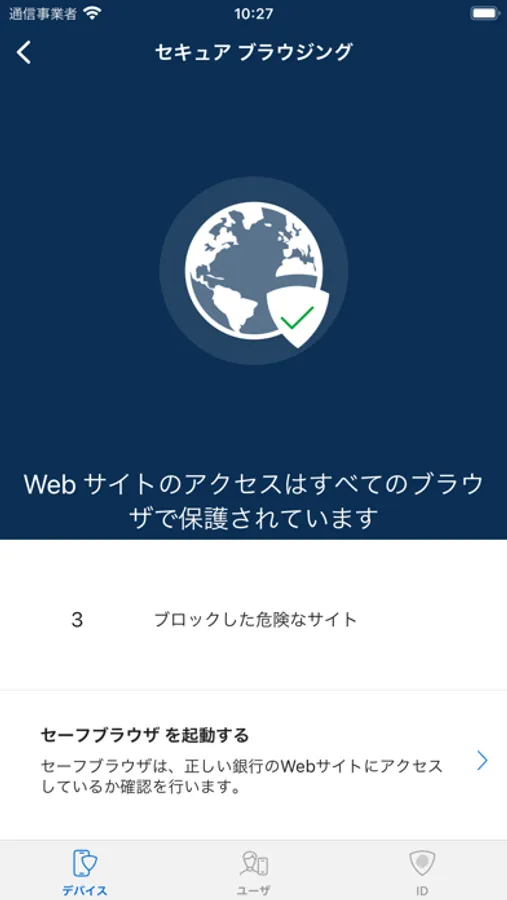 e-Defence SAFEは、iPhoneおよびiPadデバイスでの安全なブラウジング機能を提供します。危険なサイトへの接続を防止し、個人情報が流出するのを防ぎます。