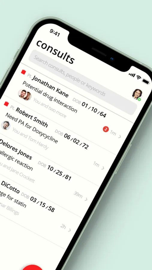 Consults: Simply create a Consult by adding the patients first and last name, dob, and subject. Then chat within the Consult, share data, resolve and archive.