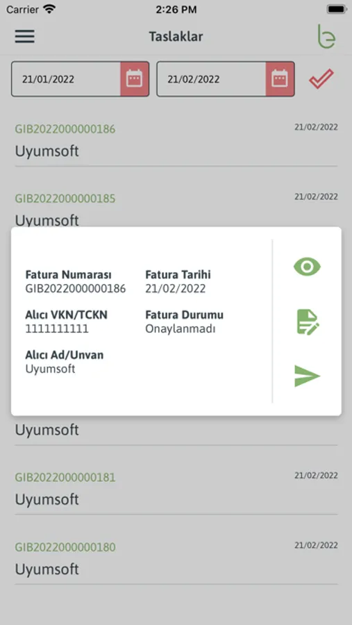 Fatura oluşturma, kaydetme ve gönderme işlemlerini uygulama üzerinden yapabilirsiniz. Oluşturulup kaydettiğiniz belgeleri taslak ekranında listeleyebilir ve ek olarak görüntüleme, düzenleme, indirme, gönderme gibi işlemleri yapabilirsiniz. Giden kutusu ekranında imzalayıp göndermiş olduğunuz faturaları listeleyebilirsiniz. Bu ekran üzerinden gönderilmiş faturalarınızı takip edebilir ve alıcısına mail olarak iletme, görüntüleme ve indirme işlemleri yapabilirsiniz. Uygulama aracılığıyla GİB e-Arşiv portal kullanıcınızla da entegrasyon sağlayabilirsiniz.