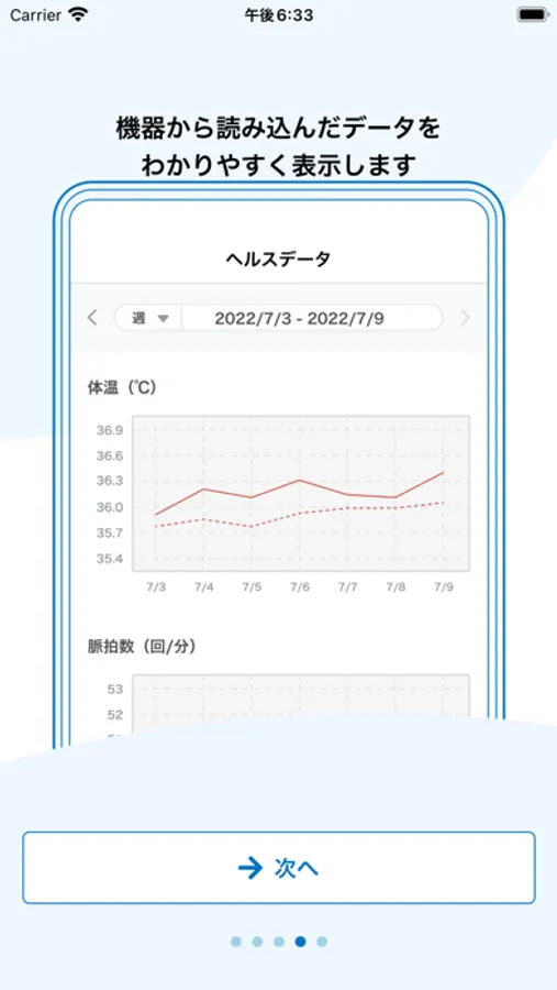 血圧、体重、活動量などの記録データをグラフ形式で表示しながら振り替えることが可能です。