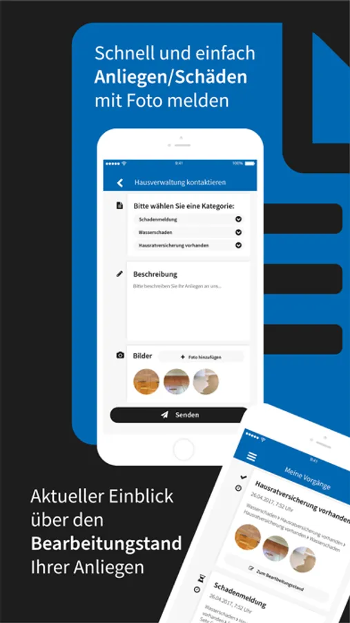 Als Mieter oder Eigentümer können Sie Schäden oder Anliegen direkt mit Fotos über unsere App melden. Ihre Anfragen stehen unseren Mitarbeiten dann zur Verfügung und können auch an Handwerksbetriebe weitergeleitet werden.