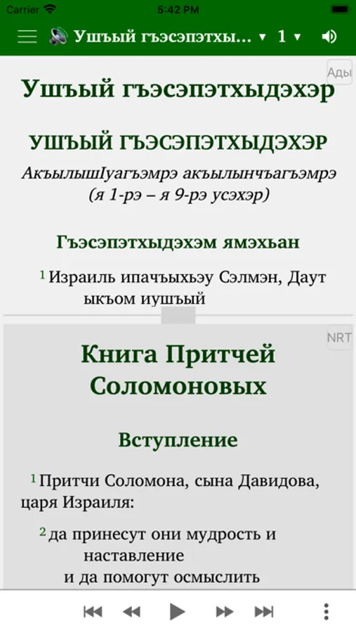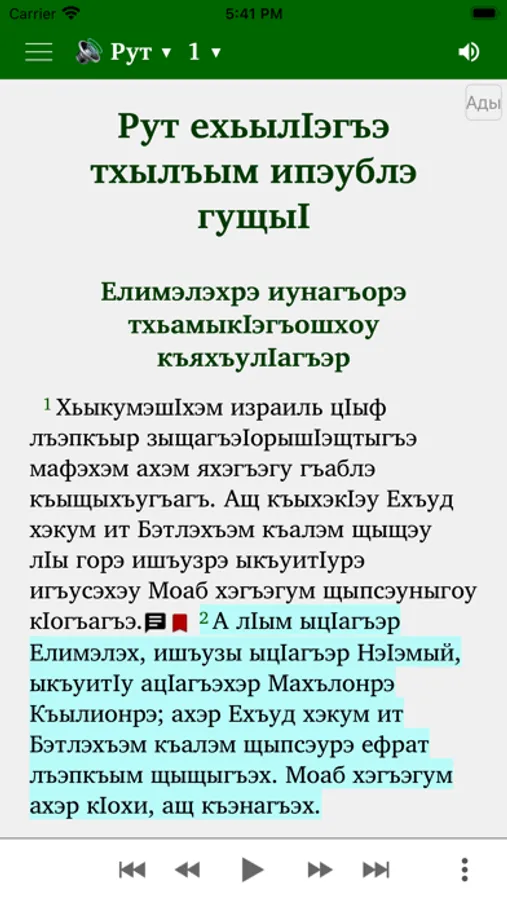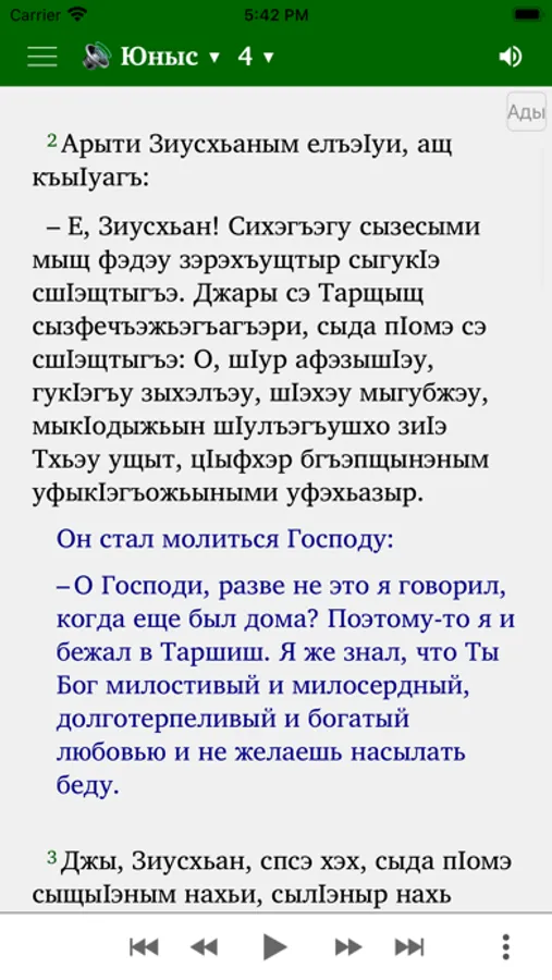 It is also possible to listen to the audio version of the Adyghe translation, with the audio files downloadable on demand.