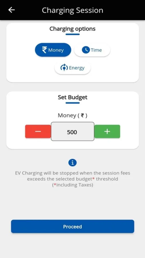 . Simple scan action, select type of charging (Time/Energy) and proceed.