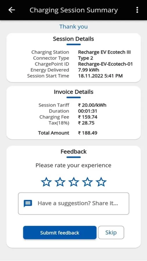 Recharge EV app allows you to locate and navigate to a charging station, easily start and stop charging, view live charging status, when the charging process is complete and pay for the electricity in easy steps.