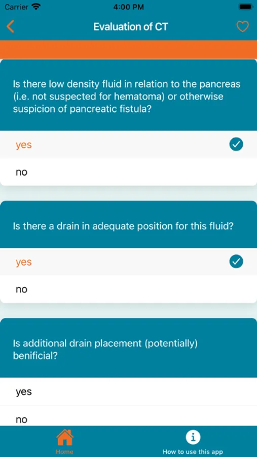 This application for bed-side use helps in early recognition and management of complications in patients after pancreatic resection. Using routine information from clinical evaluation and blood tests it generates daily recommendations on abdominal computed tomography, antibiotic treatment, radiological drainage and abdominal drain removal.