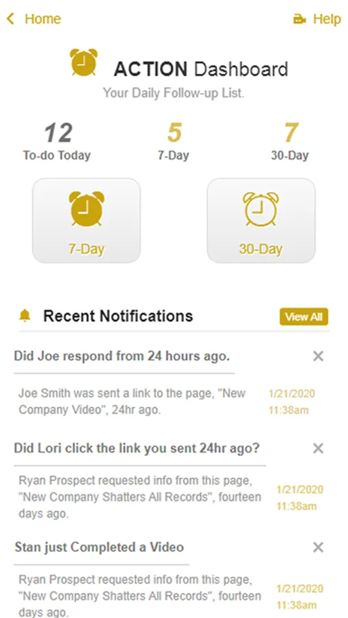 Name, Email, Phone, Prospect Score, Score History, Lead Page, Page Path, Notes, Activity History, Time/Date Stamps, Easily Call, Text, or Email Each Lead with one click.