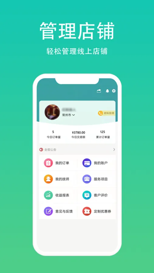 悠悠管理端,主要提供我的订单,我的账户,我的技师,服务项目,收益报表,客户评价,购物商场,意见反馈,定制优惠券等模块