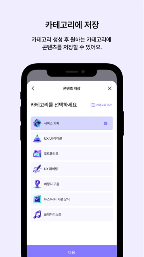 카테고리 생성 후 원하는 카테고리에 콘텐츠를 저장할 수 있어요.