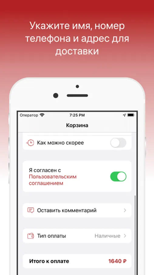 На экране заказа добавьте свою контактную информацию для первого заказа: Имя, Номер телефона и адрес электронной почты, чтобы получать уведомления об оплате.