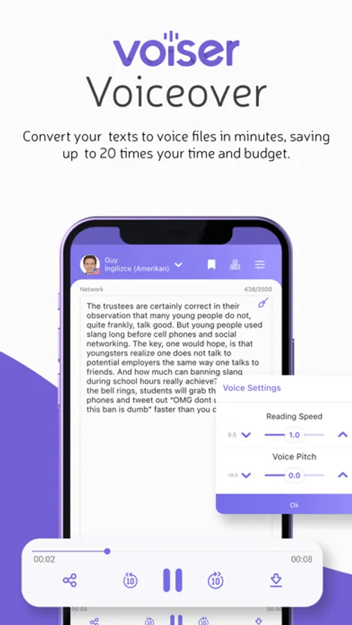 Voice your texts naturally and fluently in more than 75 languages with 550 voice tones. Edit changes like speed, volume, and pitch with the advanced voice editor.