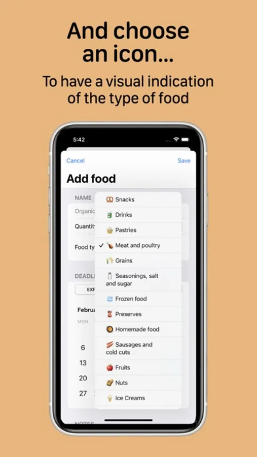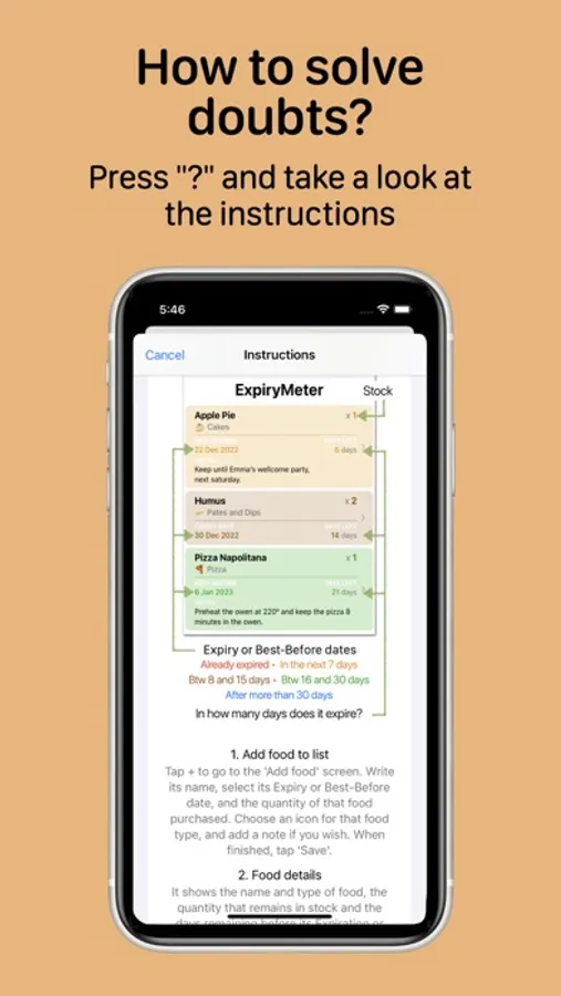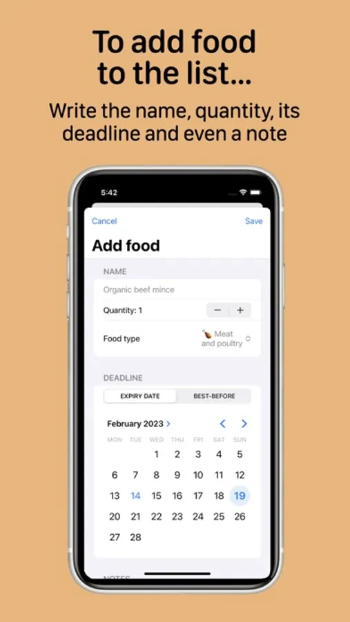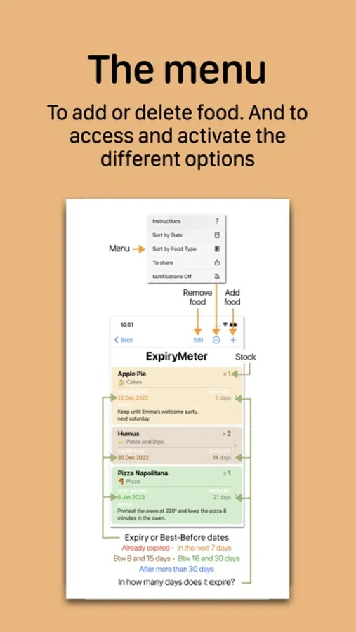— Add food to list: Tap + and write its name, the Expiry date or the Best-Before date and the quantity purchased. Choose a food icon from the suggested list and add a note if you wish.