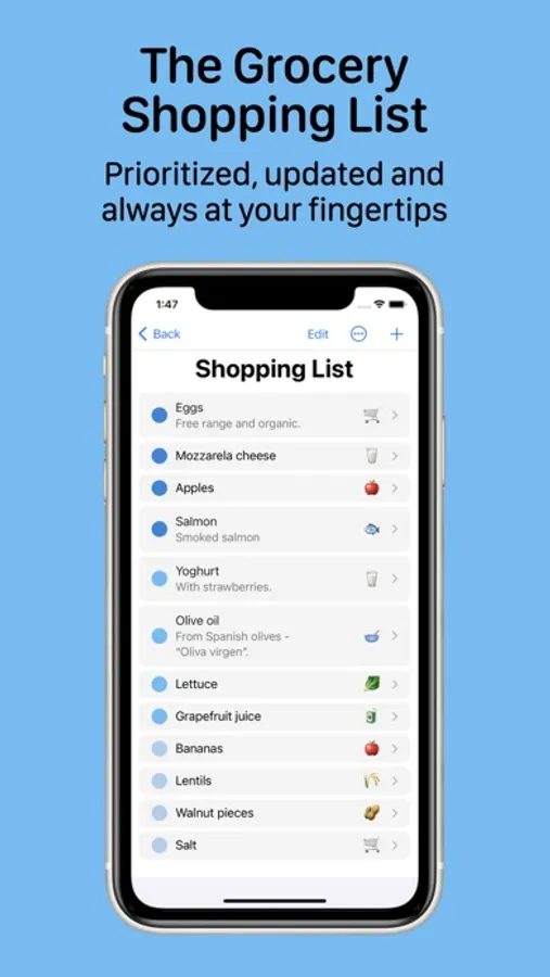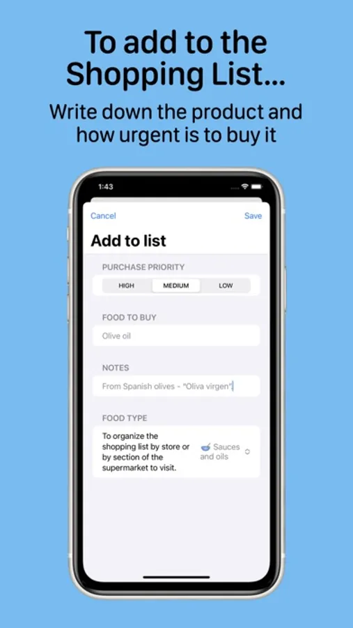 — Add to Shopping List: Tap + and write the name of the product to buy. Add a note, if you wish. And choose an icon for the food type, which will be used to sort the shopping list by 'Food type'.