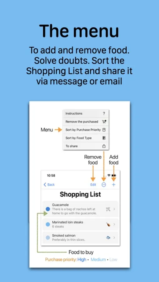 — Sort the Shopping List by 'Purchase Priority' or by 'Food type': Tap on the 'Menu' icon and choose one or the other option. Initially, the list is sorted by 'Purchase Priority'. By 'Food type', the list is sorted by product category, to guide the purchase towards the relevant store or supermarket area.