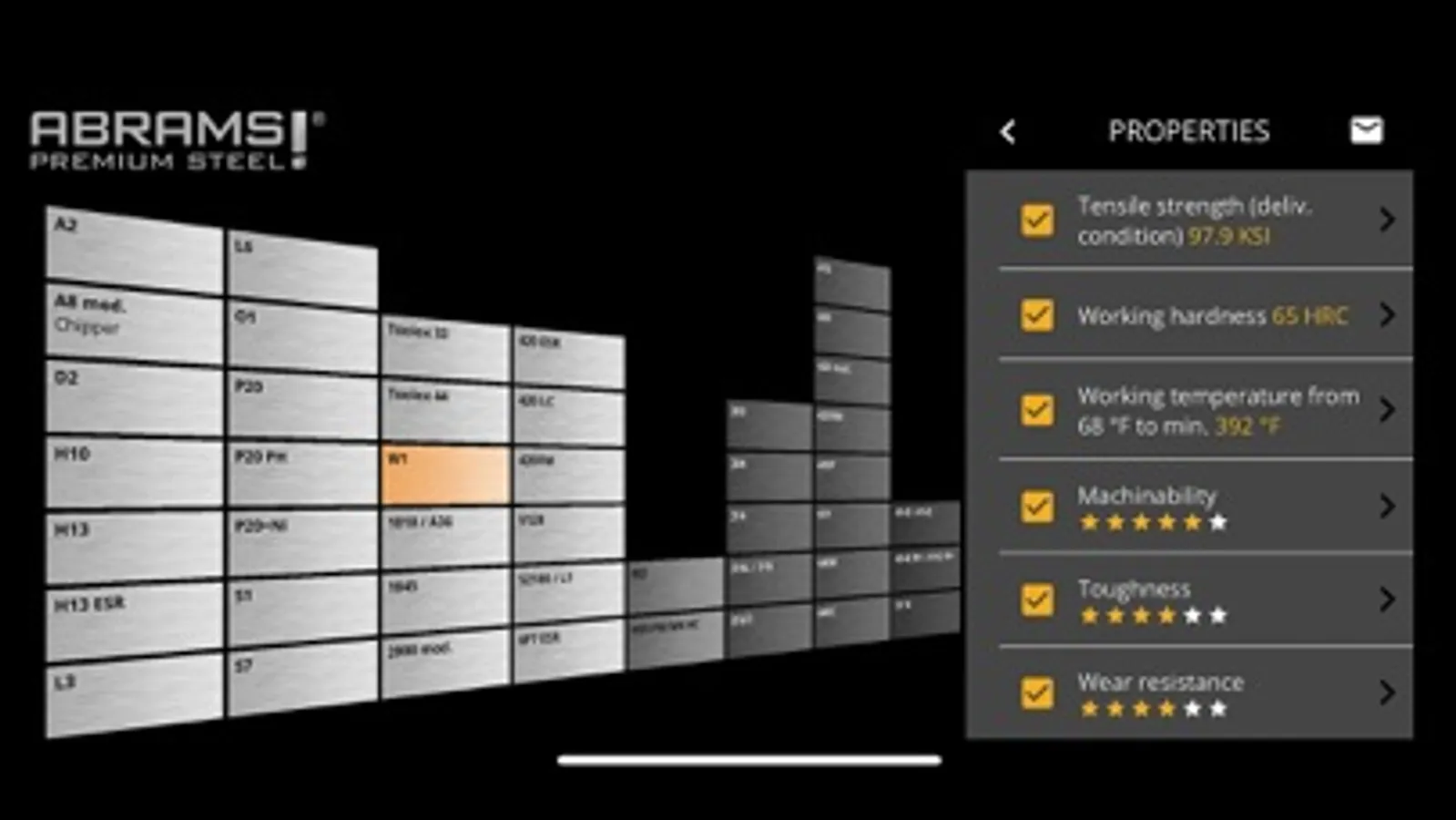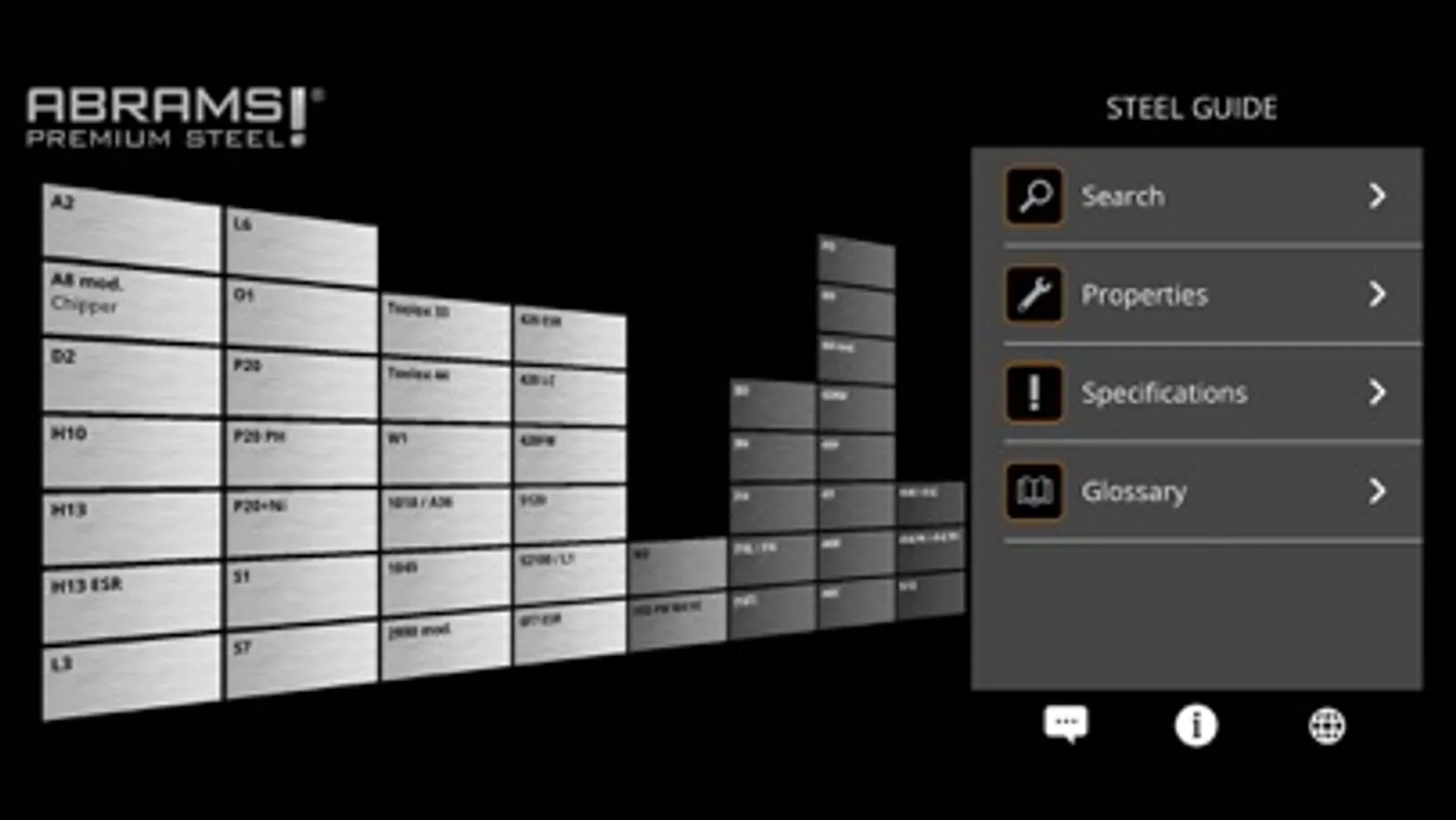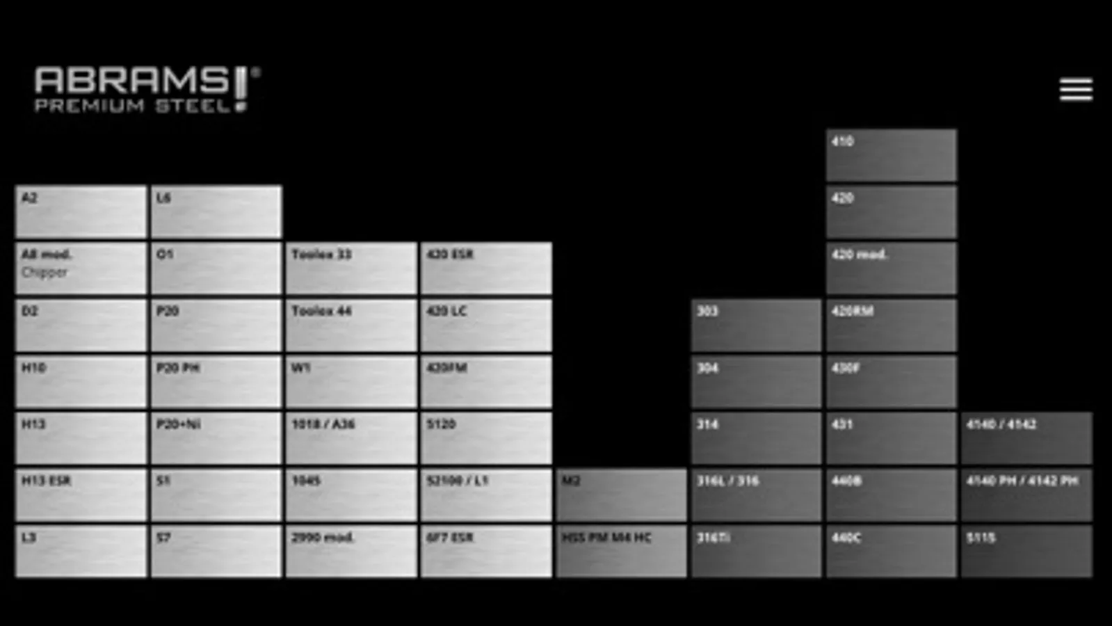 The ABRAMS STEEL GUIDE US is an interactive application which helps one to choose the perfect steel grade in the