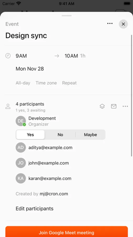 Cron Calendar brings the power and design of Cron’s macOS and Windows app to your phone. Schedule meetings and control your time like never before. Cron deeply integrates with Google Calendar accounts so that all your events and resources are synced.