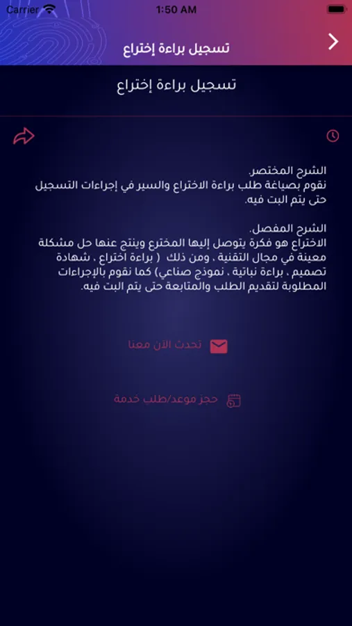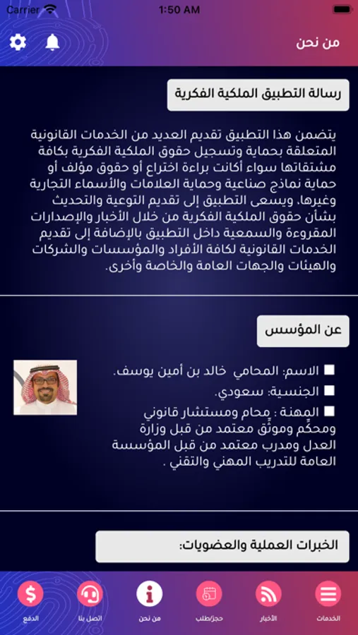 يتضمن هذا التطبيق تقديم العديد من الخدمات القانونية المتعلقة بحماية وتسجيل حقوق الملكية الفكرية بكافة مشتقاتها سواء أكانت براءة اختراع أو حقوق مؤلف أو حماية نماذج صناعية وحماية العلامات والأسماء التجارية وغيرها، ويسعى التطبيق إلى تقديم التوعية والتحديث بشأن حقوق الملكية الفكرية من خلال الأخبار والإصدارات المقروءة والسمعية داخل التطبيق بالإضافة إلى تقديم الخدمات القانونية لكافة الأفراد والمؤسسات والشركات