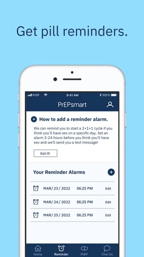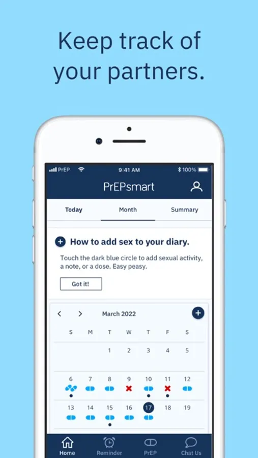 PrEPSmart 211 makes it easy to stay protected. Set pill reminders, track your pill-taking and get insights about your activity.