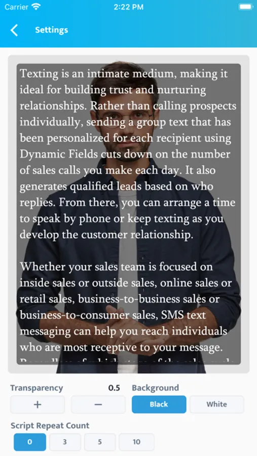 You read a pre-prepared script while recording yourself using the front/back-facing camera. Simply press record and read the script as it scrolls down the screen.