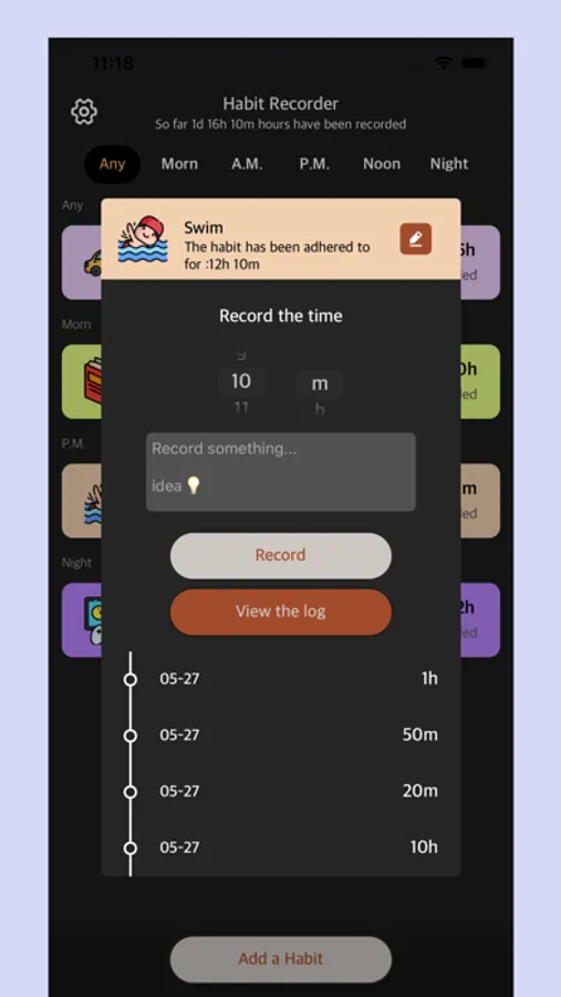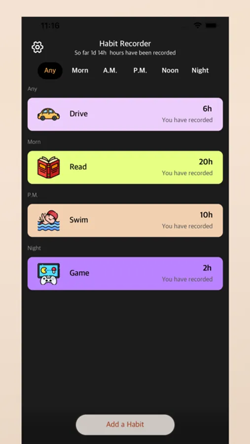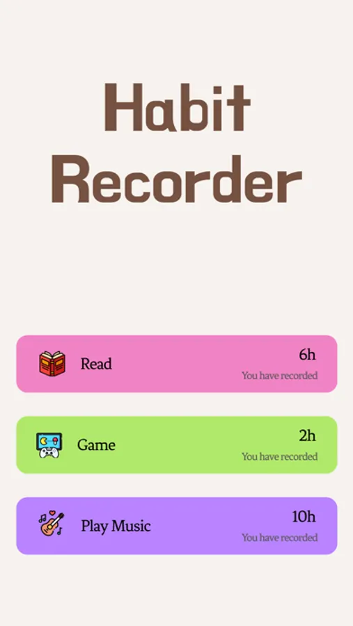 In the Habit Recorder app, you can add anything you want to do, and then in the future, as long as you do this thing, record the time you have completed, the time card will count your time, a period of time. Over time, you will see how much time you spend on something.