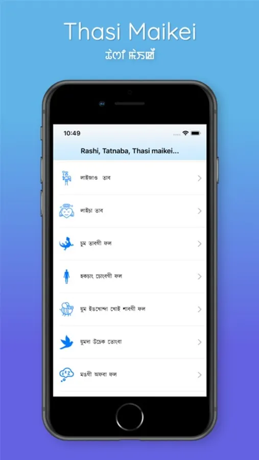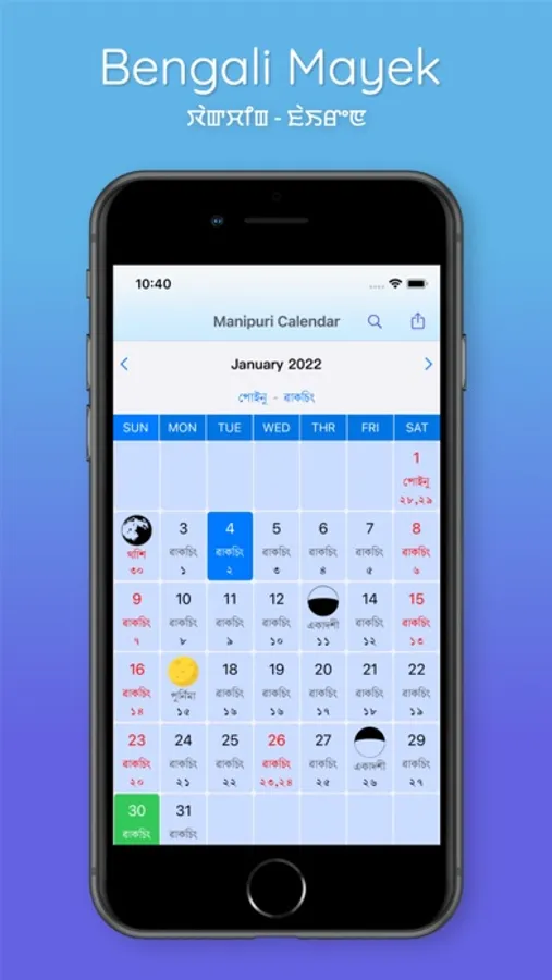 A simple Manipuri calendar for all fellow Manipuris, It has data for Manipuri Calendar 2022, updated with Manipuri Calendar 2023. It shows all the dates/days using lunar calendar. You can tap on next and previous button to navigate through months of the Manipuri Calendar months data. Meitei or Manipuri Thaban, Tatnaba and many other Manipuri culturally related information are provided in the app.