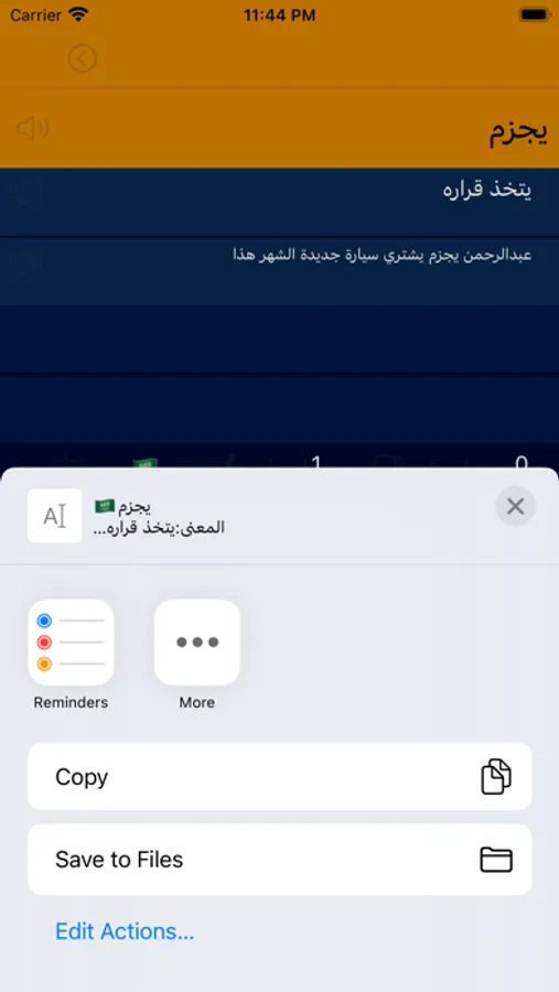 You can share the meaning by clicking the share button then copy, the app will copy the meaning, example and country, you just paste it anywhere