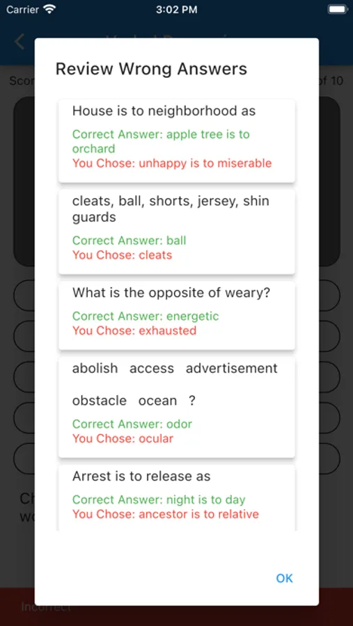 We present a quiz of 10 questions in 4 or 5 broad categories from a bank of questions stored in the app. You get a score and the number right/wrong as well as indication of correct answers when tapped. Some sections have a review that shows where you went wrong.