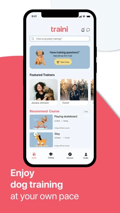 Traini is an interactive AI-based dog training platform. It offers digital courses and real-time trainer online guidance and AI capturing the dog's training posture to give action correction and feedback, All the fun dog training courses in one APP, such as behavioral training, skateboarding, surfing, skiing, etc. Creating the world's first and only community-native ChatGPT for Pet Care, Dr.Traini.