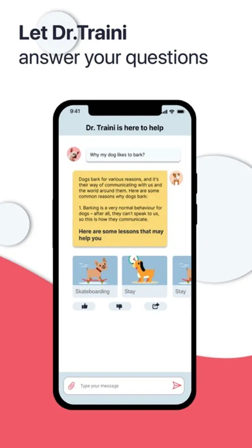 Traini App is a training app for dog parents. It includes all the necessary commands, action corrections by AI, and PetGPT. We have 4 programs to choose from (New Dog Puppy Program, Basic Obedience, Potty Training, Stay Active). Get 200+ exclusive guided videos for all essential skills and behaviors (reliable recall, leash training, sitting, come, down, stay, puppy potty training, welcoming a new adopt pet, puppy games, house training, fetch the leash, stopping puppy biting, not jumping on people, separation anxiety, dog bark control and stop, dog voice and noise control, tail wag, calm around other dogs, staying on a place, loose-leash walking, impulse control, high-five, give a paw, rollover, peekaboo, spin, weave, jump over, crawl and much more), learn tricks, play games and enjoy the dog life with your pooch.