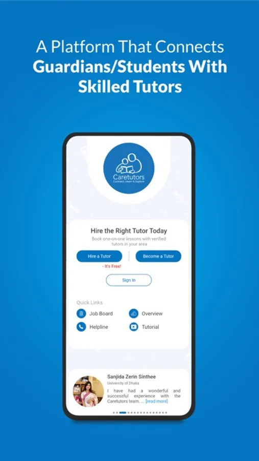 Caretutors is first ever online platform in Bangladesh to hire tutors and search tuitions. It was founded in 2012. Now the platform has available four types of tutoring. Those are- Home Tutoring, Online Tutoring, Group Tutoring and Package Tutoring. Home tutoring service is available in all the major cities in Bangladesh such as Dhaka, Chattogram, Sylhet, Khulna, Rajshahi, Barishal, Rangpur, Mymensingh, Savar, Gazipur, Narayanganj & Cumilla. And in online, it's available in all over Bangladesh. Moreover, service of this platform is also expanded in the Middle East (Saudi Arabia, UAE, Oman, Qatar, Kuwait). It’s vision is to connect the learner with the right tutor.