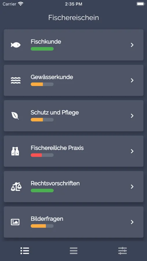 Lernfortschrittsanzeige, Auswertungen und Merklisten helfen die zufällig generierten Übungsprüfungen mit 12 Frage aus 5 Kategorien zu meistern.